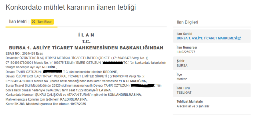 Bursa 1. Asliye Ticaret Mahkemesi, davada konkordato talepleriyle ilgili önemli kararlar aldı. Özünteks İlaç İtriyat Medikal Ticaret Limited Şirketi ile şirket ortaklarından Emre Öztüzün ve Tahir Öztüzün'ün yaptığı başvurularla ilgili yapılan yargılama neticesinde, taleplerin bir kısmı reddedilirken bir kişi hakkında iflas kararı verildi.