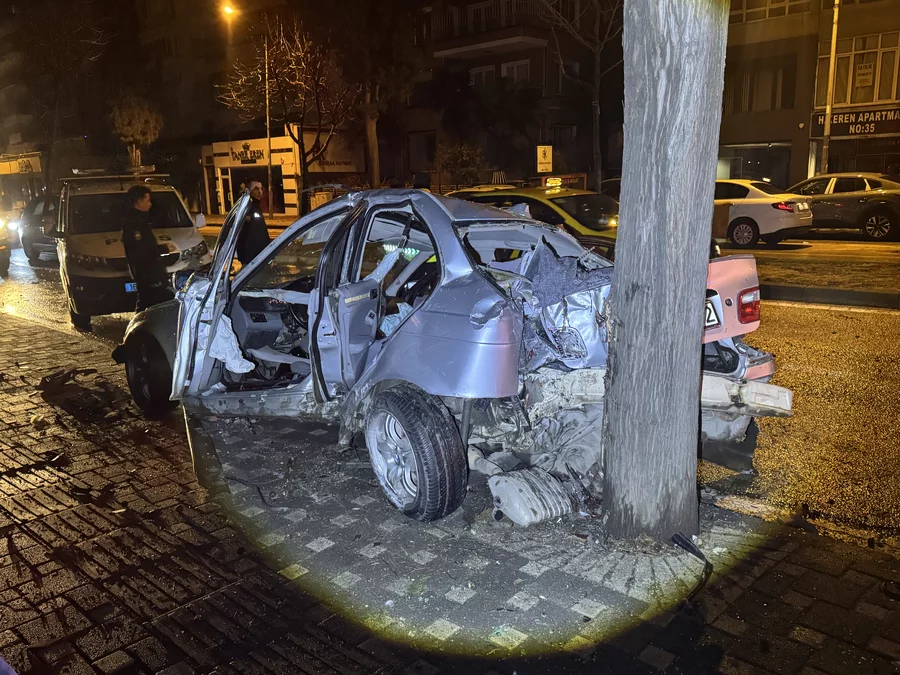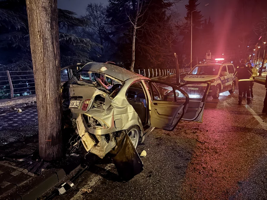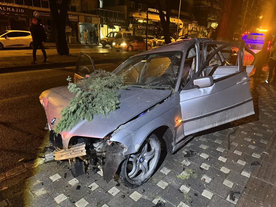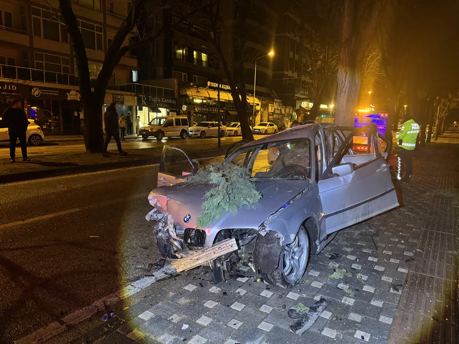 Kontrolden çıkan otomobil önce kaldırımda bulunan trafik uyarı levhasına çarptı, ardından savrularak ağaca vurdu.
