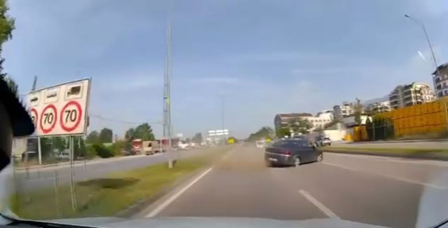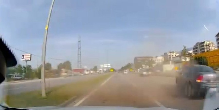 Bursa'da hareket halindeyken lastiği patlayan otomobil, orta refüjü aşarak karşı şeride geçti. Saniyelerle facianın kıl payı atlatıldığı diğer istikamete giden otomobildeki araç kamerası tarafından kayda alındı.