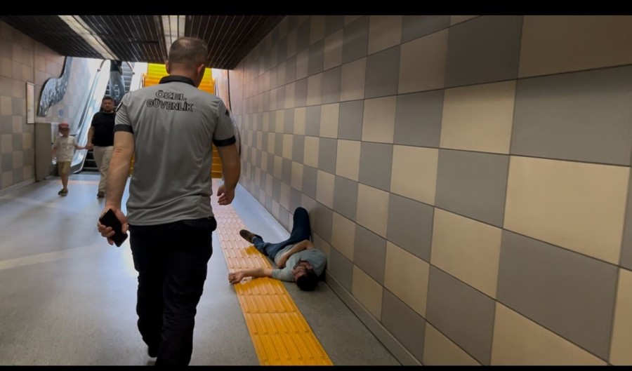 Bölgeden geçen vatandaşlar şaşkın bakışlarla durumu izlerken, görevli güvenlik personeli şahsı kaldırmak için çaba sarf etti.