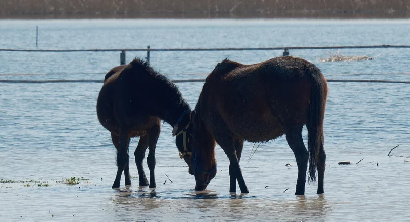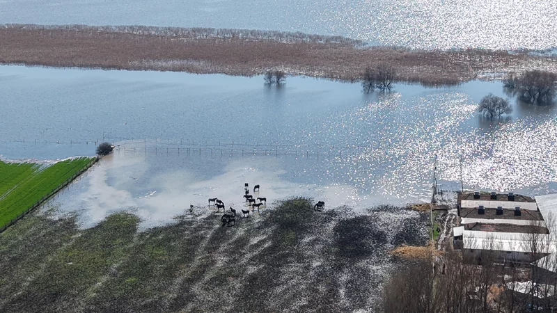 Bursa'nın Karacabey ilçesindeki Uluabat Gölü'ne yakın milyonluk yarış atlarının bulunduğu tavlalar su altında kaldı. Atlar, su içinde gezinirken drone ile görüntülendi.