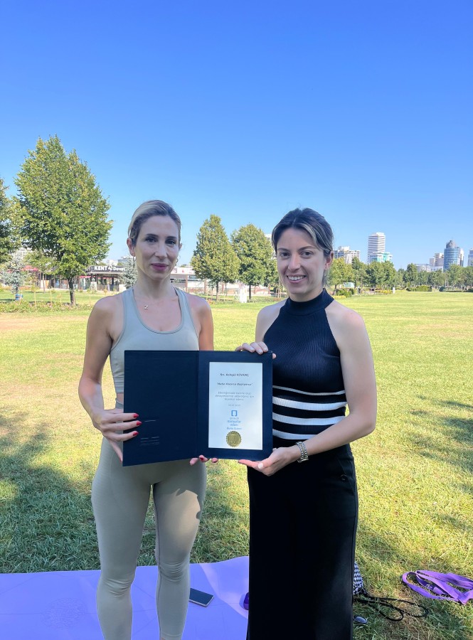 Pilates Eğitmeni Aslıgül Kıvanç'a katkılarından dolayı teşekkür plaketi takdim eden Bahar Kuş, bu tür etkinliklerin mimarları bir araya getirerek mesleki dayanışmayı güçlendirdiğini ve sağlıklı yaşam alışkanlıklarının teşvik edilmesinde önemli rol oynadığını vurguladı.