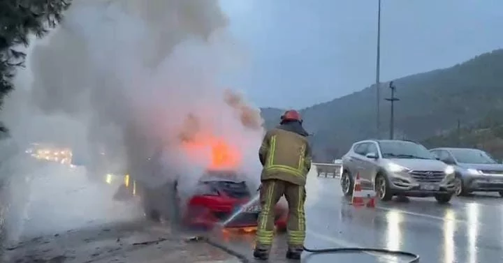 Mudanya Yolu'nda motor arızası nedeniyle duran otomobil, kısa sürede alevlere teslim oldu.