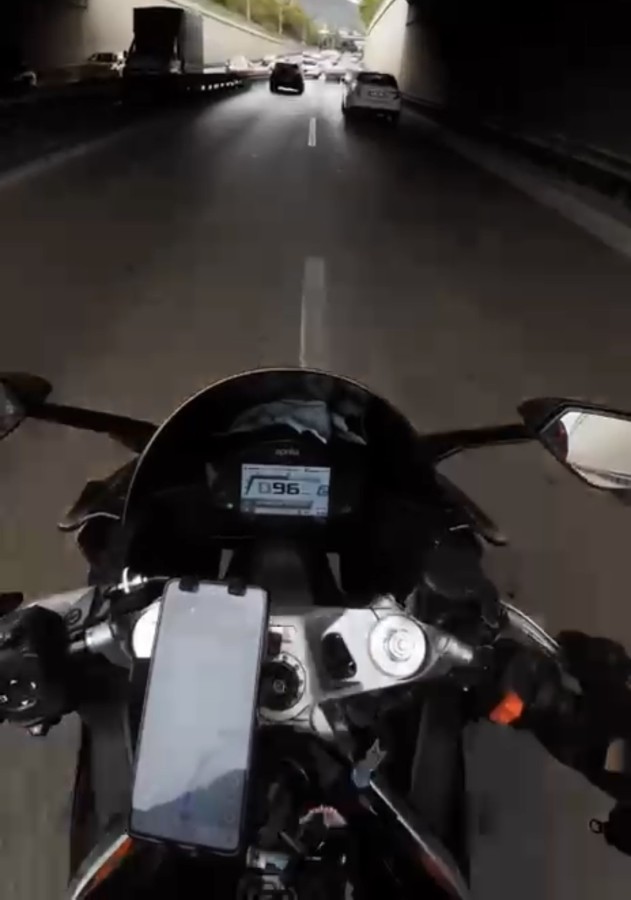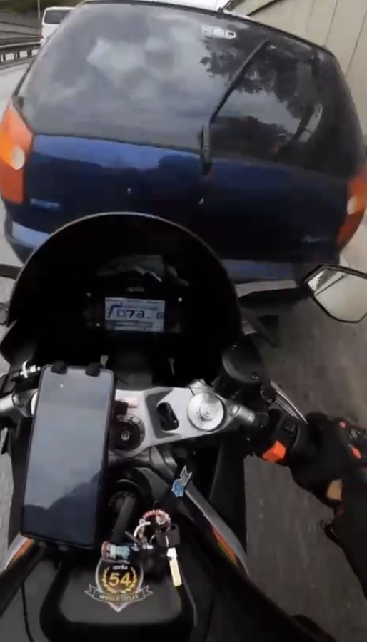 Kask kamerasına yansıyan görüntülerde, otomobilin ani manevrası ve çarpışma anı net bir şekilde görülüyor.