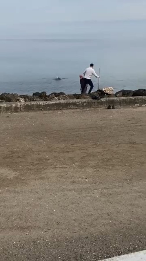 Martının su üzerinde hareketsiz şekilde çırpınmaya çalıştığını gören vatandaş, hiç tereddüt etmeden kıyafetleriyle birlikte denize girerek martıyı güvenli bir alana çıkardı.