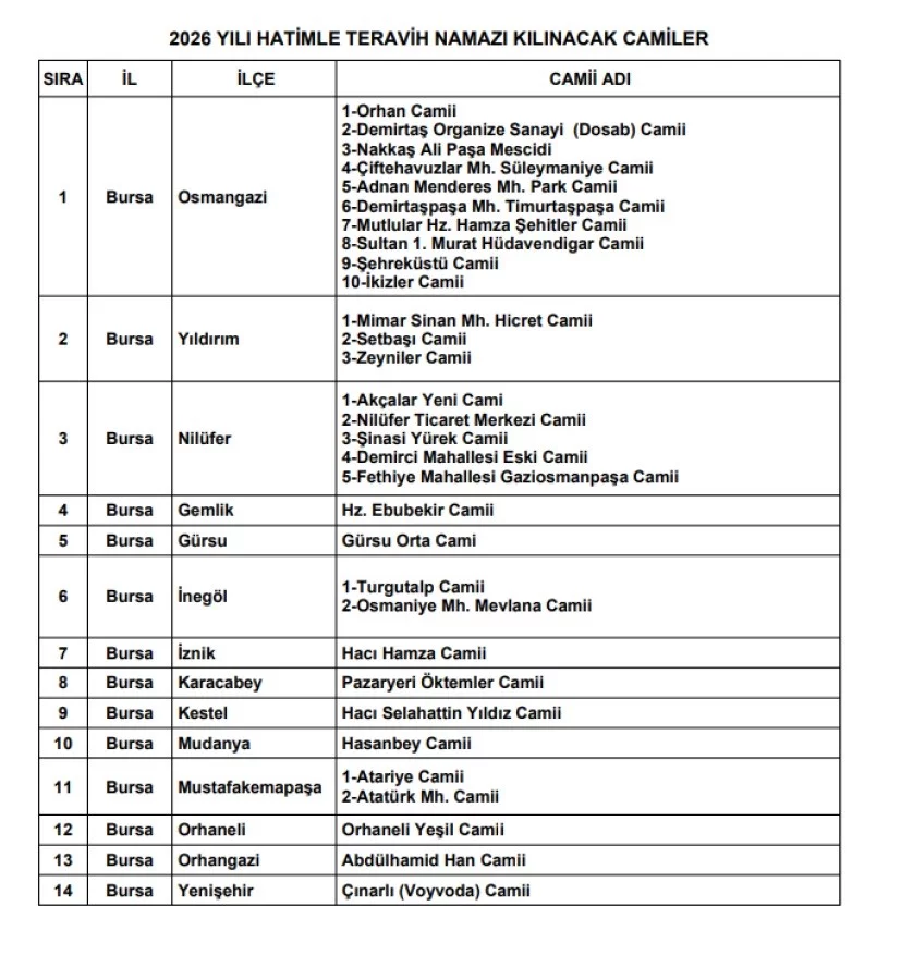 Bursa İl Müftülüğü, 2026 Ramazan ayı boyunca Bursa genelinde hatimle teravih namazı kılınacak camilerin listesini açıkladı. Açıklamaya göre, merkez ve ilçeler dâhil toplam 14 ilçede belirlenen camilerde teravih namazları hatimle eda edilecek.