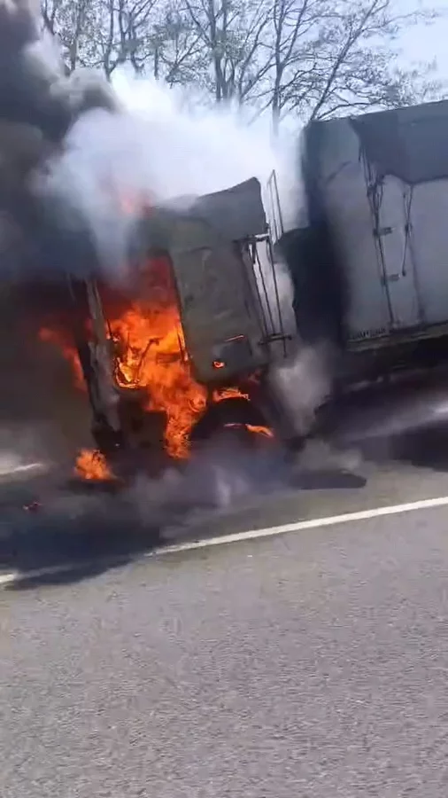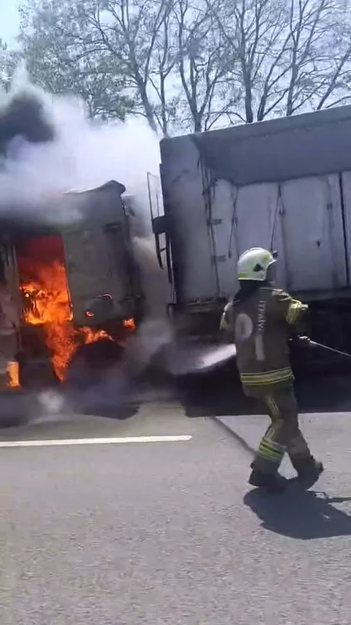 Bursa'nın İnegöl ilçesinde seyir halinde olan tır alev alev yandı.