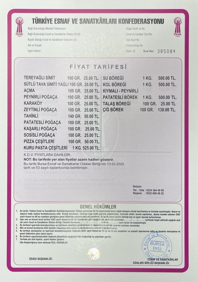 Bursa Simitçiler ve Unlu Madde İmalatçıları Esnaf ve Sanatkarlar Odası, yeni fiyat listesini açıkladı. Ham madde, doğal gaz, kira ve personel giderleri sebebiyle zam yapıldığı belirtildi.