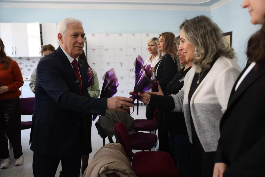 Buluşma öğrenciler için unutulmaz bir anıya dönüşürken, Başkan Mustafa Bozbey, kadın öğretmenlere de Dünya Kadınlar Günü dolayısıyla çiçek hediye etti.