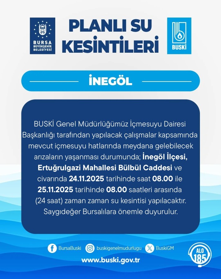 "BUSKİ Genel Müdürlüğümüz İçmesuyu Dairesi Başkanlığı tarafından yapılacak çalışmalar kapsamında mevcut içmesuyu hatlarında meydana gelebilecek arızaların yaşanması durumunda; İnegöl İlçesi, Ertuğrulgazi Mahallesi Bülbül Caddesi ve civarında 24.11.2025 tarihinde saat 08.00 ile 25.11.2025 tarihinde 08.00 saatleri arasında (24 saat) zaman zaman su kesintisi yapılacaktır."