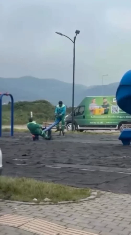Osmangazi ilçesinde görev yapan temizlik personeli, çalışma sırasında parkta bulunan tahterevalliye binerek kısa süreli eğlendi. O anlar cep telefonu kamerasına yansırken, görüntüler sosyal medyada da ilgi gördü.