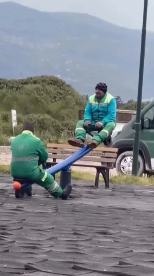 Bursa'da görev yapan belediye temizlik işçilerinin iş arası verdikleri kısa molada tahterevalliye binerek sergiledikleri samimi görüntüler gündem oldu.
