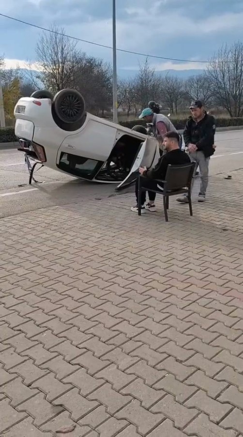 Takla atan otomobil ters durdu. Kaza sonucu yaralanan genç sürücü çevredeki vatandaşlar tarafından otomobilden çıkarıldı.