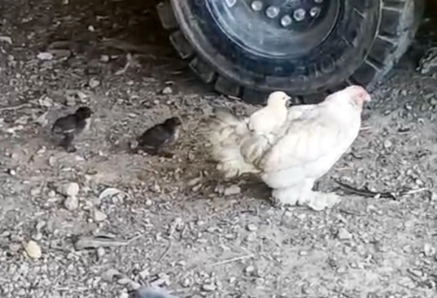Tamirhane içinde gezinen tavuğun siyah olan 2 yavrusu yanında dolaşırken, beyaz olanı sırtına çıktı.