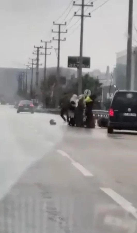 Bursa'nın Kestel ilçesinde seyir halindeki sürücü ile kurye arasında çıkan kavgada tekme ve yumruklar havada uçuştu. Araçtan inen sürücü, motokuryeyi darp ederken, kadınlar olayı ayırmak için var gücüyle çabaladı. Araçtan inen bir çocuk ise o anları şaşkınlıkla izledi.