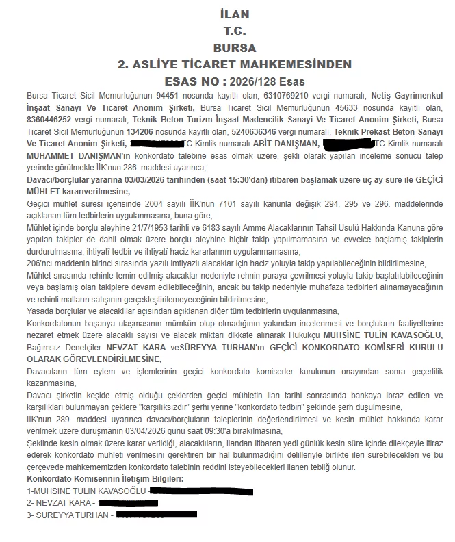 Mahkeme konkordato talebi kapsamında Netiş Gayrimenkul İnşaat Sanayi ve Ticaret A.Ş., Teknik Beton Turizm İnşaat Madencilik Sanayi ve Ticaret A.Ş. ve Teknik Prekast Beton Sanayi ve Ticaret A.Ş. ile şirket ortakları Abit Danışman ve Muhammet Danışman hakkında yapılan başvuru incelendi.