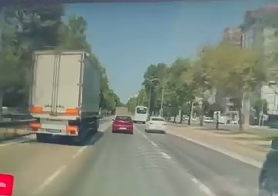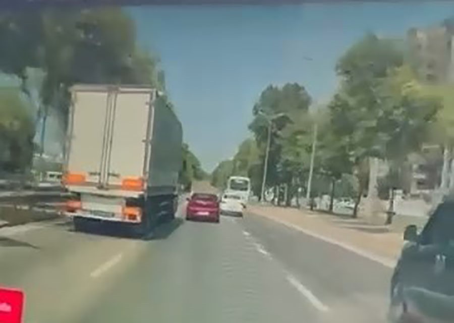 Sol şeritten ilerleyen tır, beyaz otomobilin ilerlediğini görünce orta şeride geçmek istedi. Ancak orta şeritte kör noktasında kalan kırmızı aracı fark etmedi.
