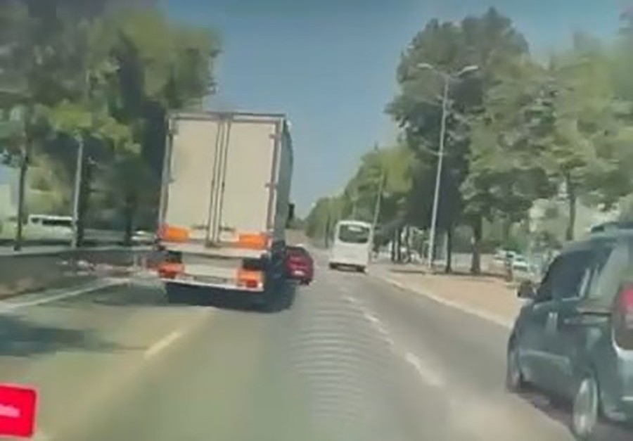 Direksiyonu sağa kırmasıyla birlikte, kırmızı araç tırın önünü yan dönerek sürüklenmeye başladı. Kısa süre sonra otomobili fark eden tır sürücüsü, durdu.