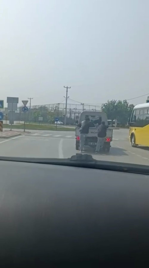 Bursa'da 2 gencin kasalı kamyonet arkasındaki tehlikeli yolculuğu kameraya yansıdı.