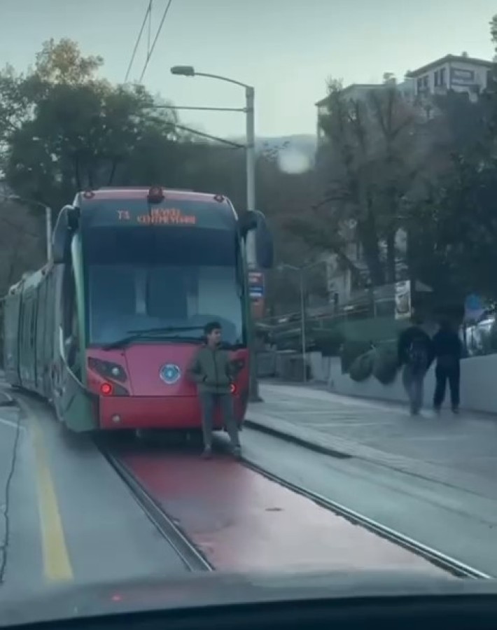 Edinilen bilgiye göre, şehir içi ulaşımı sağlayan tramvayın arka bölümüne tutunup oturarak ilerleyen çocuğu fark eden vatandaşlar, duruma tepki gösterdi.