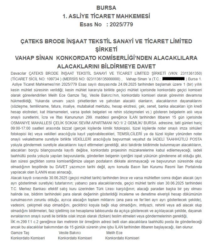 Bursa 1. Asliye Ticaret Mahkemesi, Çateks Brode İnşaat Tekstil Sanayi ve Ticaret Limited Şirketi ile Vahap Sinan hakkında 24 Eylül 2025 tarihinden itibaren başlamak üzere 1 yıllık kesin mühlet kararı verdi.
