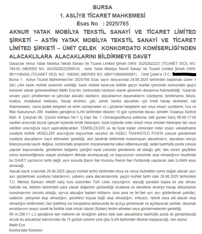 Mahkeme Aknur Yatak Mobilya Tekstil Sanayi ve Ticaret Ltd. Şti., Astin Yatak Mobilya Tekstil Sanayi ve Ticaret Ltd. Şti. ve Ümit Çelek hakkında 24 Eylül 2025 tarihinden itibaren geçerli olmak üzere 1 yıllık kesin mühlet kararı verdi.