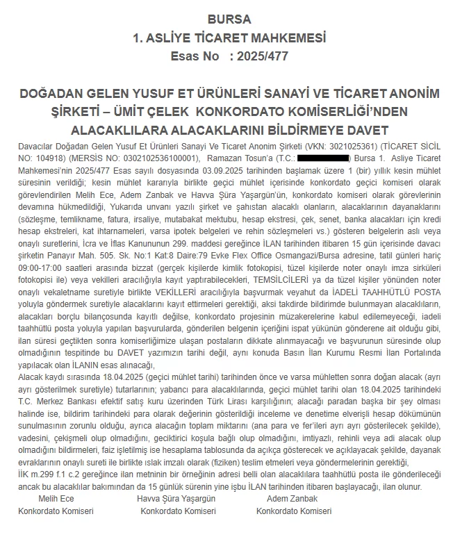 Bursa 1. Asliye Ticaret Mahkemesi, Doğadan Gelen Yusuf Et Ürünleri Sanayi ve Ticaret A.Ş. ile Ramazan Tosun hakkında da 3 Eylül 2025 tarihinden itibaren başlamak üzere 1 yıllık kesin mühlet kararı verdi.