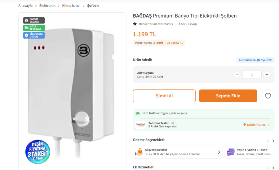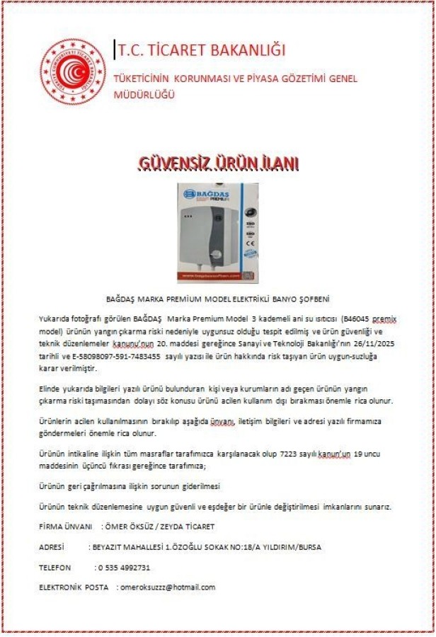 Ticaret Bakanlığı Tüketicinin Korunması ve Piyasa Gözetimi Genel Müdürlüğü, Bursa'da üretilen Bağdaş marka Premium Model elektrikli banyo şofbeni hakkında "güvensiz ürün" kararı vererek toplatma süreci başlattı. Bakanlığın resmi uyarısına karşın çok sayıda online alışveriş sitesinde hala satışta olması dikkat çekti.