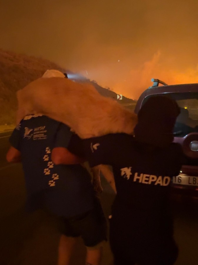 Yangınla birlikte barınaklara ve doğal yaşam alanlarına ulaşan hayvanseverler, başta kedi ve köpekler olmak üzere çeşitli türden hayvanları bulundukları riskli alanlardan çıkararak koruma altına aldı.