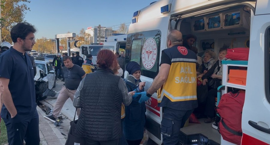 Bursa'da iddiaya göre yarış yapan iki otomobil kontrolden çıkarak önce belediye otobüsüne ardından kaldırıma çarptı. Meydana gelen kazada 13 kişi yaralandı.