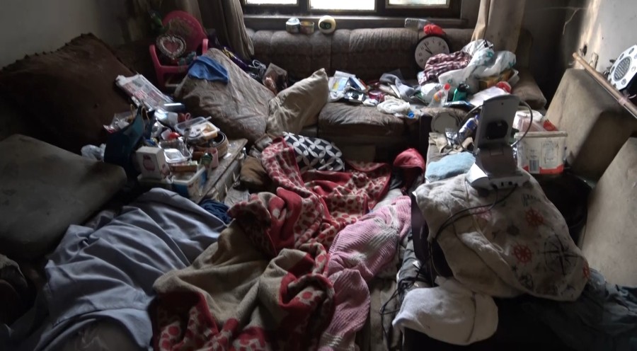 İçerideki ağır koku, yemek artıkları, yığınla çöp ve böcek istilası nedeniyle eve Temizlik işlerine bağlı ekipler sevk edildi.