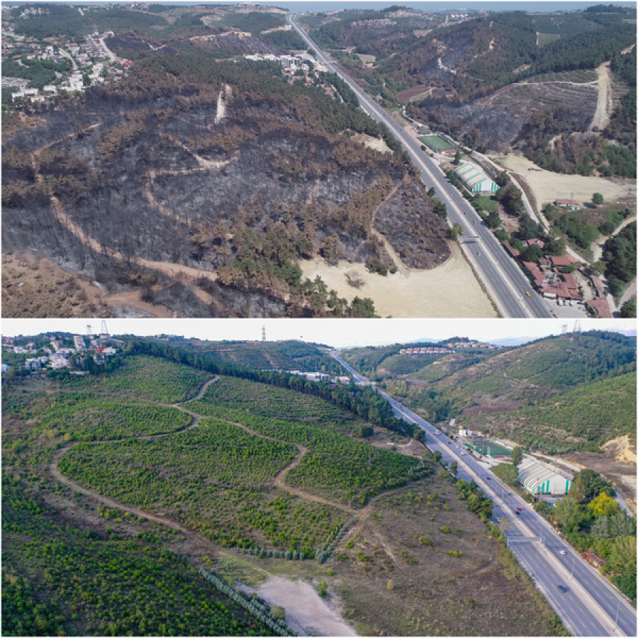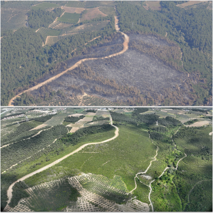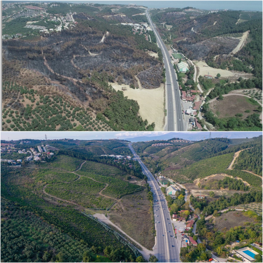 Bursa'nın Mudanya ilçesinde 2015 ve 2018'de çıkan orman yangınlarında tahrip olan alanlar, Bursa Orman Bölge Müdürlüğünün çalışmalarıyla yeniden yeşeriyor.