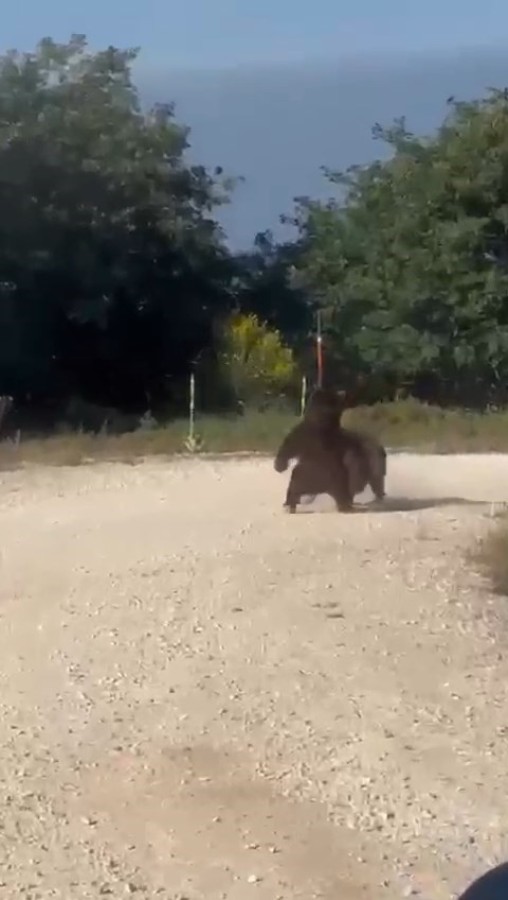 Bursa'nın Gemlik ilçesinde yolun ortasında güreşe tutuşan ayılar, korku dolu anlara sahne oldu. Vatandaşın cep telefonu kamerasına yansıyan görüntülerde, ayılar daha sonra yoldan aşağı yuvarlandı.