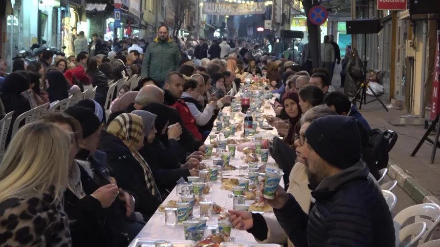 Yüzlerce metre boyunca kurulan uzun iftar sofraları mahalle sakinlerini ve şehir dışından gelen misafirleri bir araya getirdi.