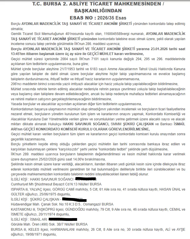 Bursa 2. Asliye Ticaret Mahkemesi, Aydınlar Madencilik Taş Sanayi ve Ticaret A.Ş. hakkında yapılan konkordato başvurusunu değerlendirerek şirket lehine 23 Ocak 2026 saat 13.45 itibarıyla başlamak üzere 3 ay süreyle geçici mühlet kararı verdi.