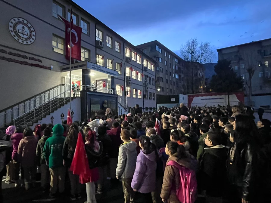 Sabahın erken saatlerinde okul bahçesinde bir araya gelen öğretmenler ve öğrenciler; depremde hayatını kaybeden vatandaşlarımız için gerçekleştirilen saygı duruşunun ardından İstiklal Marşı'nı hep birlikte okuyarak birlik ve beraberlik duygularını pekiştirdi.
