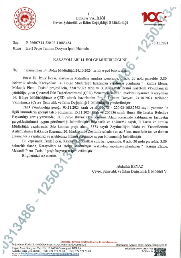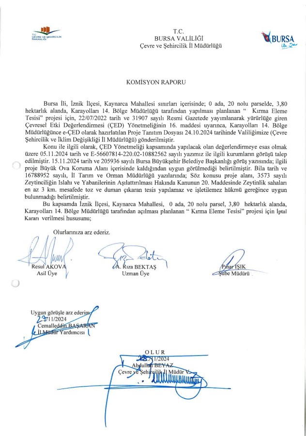 Ayrıca Bursa Büyükşehir Belediyesi'nin görüş yazısında söz konusu proje alanının "3573 sayılı Zeytinciliğin Islahı ve Yabanilerin Aşılattırılması Hakkında Kanunun 20. Maddesinde Zeytinlik Sahaları en az 3 km. mesafede toz ve duman çıkaran tesis yapılamaz ve işletilemez" hükmü gereğince de reddedildiği yer aldı.