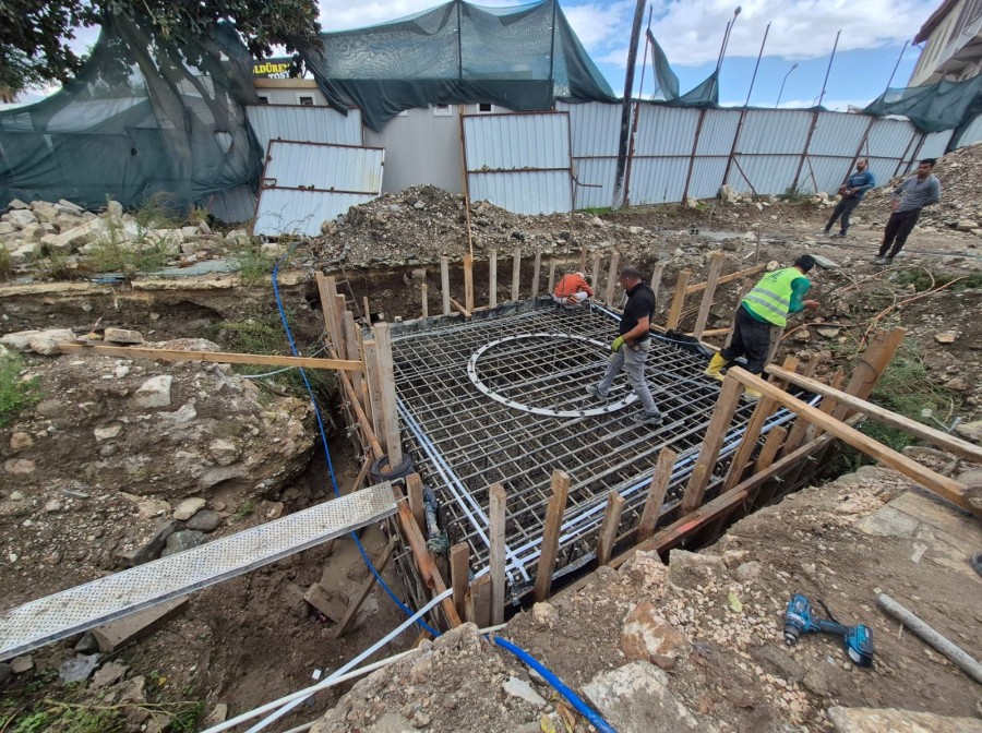 Ulu Cami kadınlar mescidinin temel imalatlarını da sürdüren ekipler, minare temel donatılarını da tamamlandı.