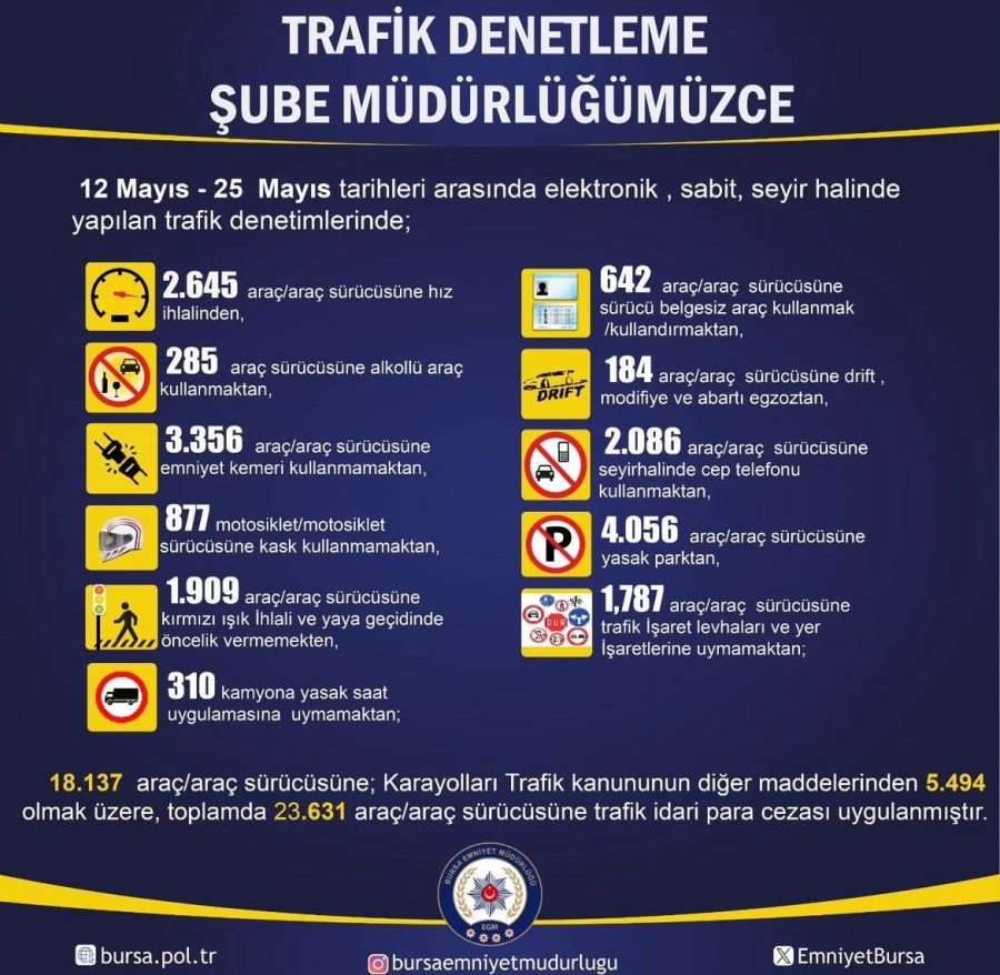Bursa Emniyet Müdürlüğü'nün iki haftalık ceza bilançosu şöyle: "3 bin 356 sürücüye emniyet kemeri, 4 bin 56 sürücüye yasak yere park etmekten, 2 bin 86 sürücüye araç kullanırken cep telefonu ile konuşmaktan, 1 bin 909 sürücüye kırmızı ışık ihlali yapmaktan veya yaya geçidinde yayalara öncelik vermemekten, 877 motosiklet sürücüsüne kask takmamaktan, 285 sürücüye alkollü araç kullanmaktan, 642 kişiye belgesiz araç kullanmaktan, 184 sürücüye drift yapmaktan, modifiye ya da abartı egzoz kullanmaktan, 310 kamyon sürücüsü yasak saatlerde trafiğe çıkmaktan, 2 bin 645 sürücüye hız limitlerini aşmaktan, 1 bin 787 sürücüye ise trafik işaret ve levhalarına uymamaktan idari ceza uygulandı"
