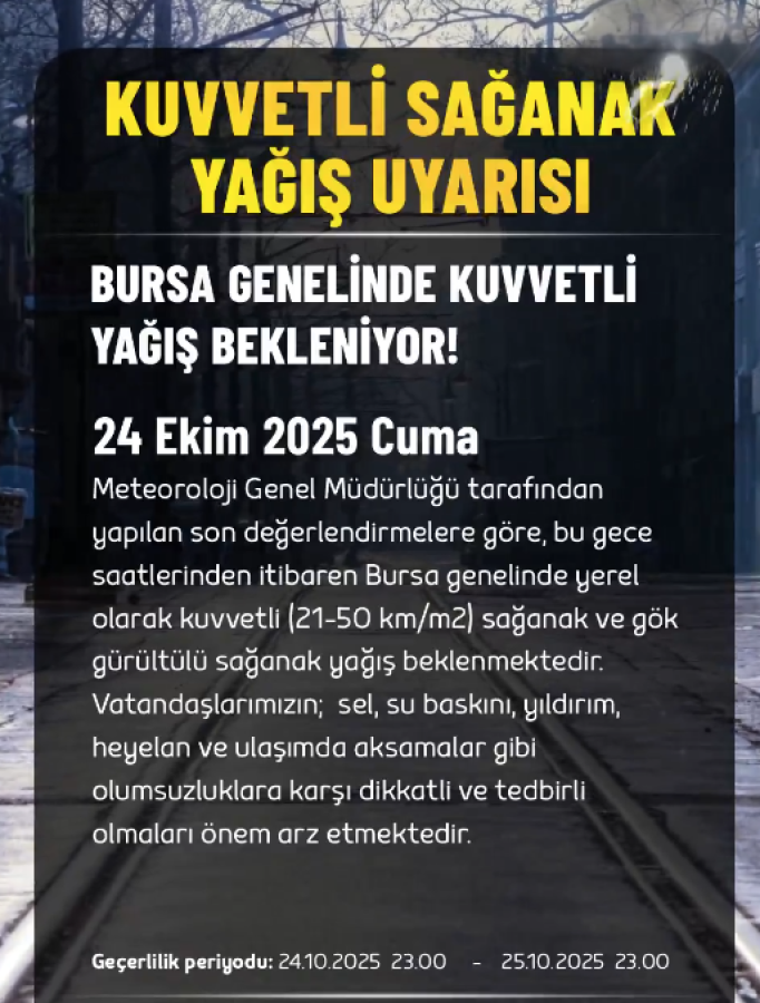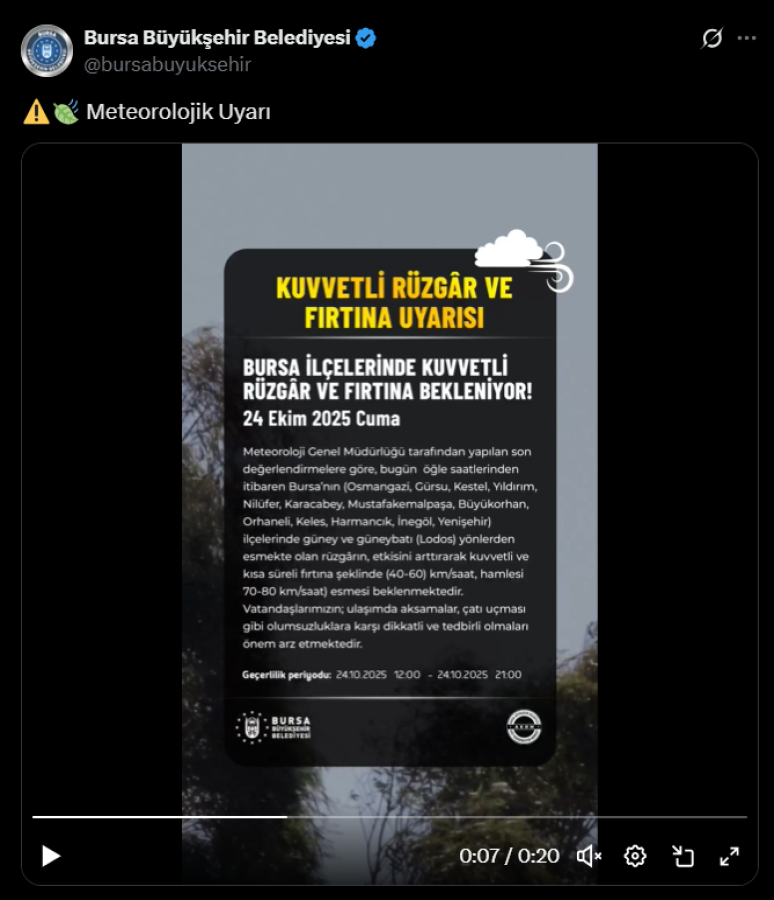 Meteoroloji Genel Müdürlüğü'nün son değerlendirmelerine göre, bugün Bursa genelinde kuvvetli rüzgar ve fırtına bekleniyor. Bursa Büyükşehir Belediyesi, vatandaşlara dikkatli ve tedbirli olmaları çağrısında bulundu.