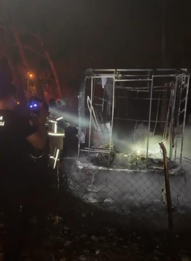 İznik'te Göllüce - Aydınlar arası sahil kenarında park halinde bulunan bir karavan, gece yarısı eşyaları ile birlikte alev almaya başladı. Son günlerde devam eden orman yangınlarından dolayı vatandaş panik yaşadı.