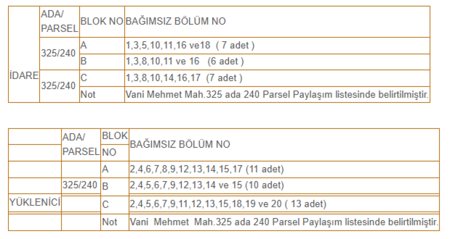 Belediyeye toplam 20 bağımsız bölüm, yükleniciye ise 34 bağımsız bölüm verilecek.