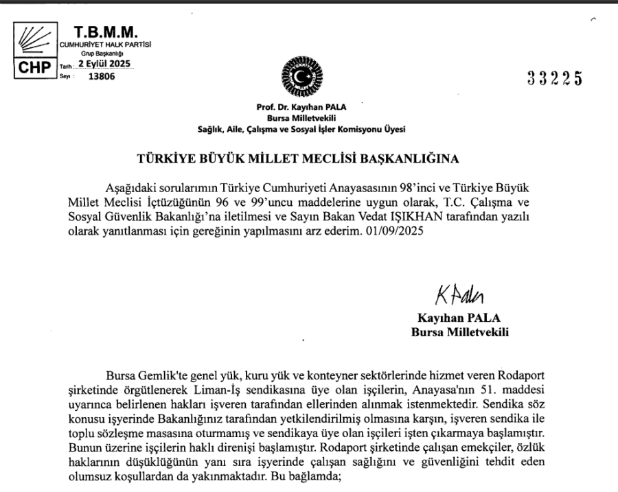 CHP Bursa Milletvekili Prof. Dr. Kayıhan Pala, Rodaport'ta sendikalı işçilerin işten çıkarılması ve işçi sağlığı-iş güvenliği ihlalleriyle ilgili Çalışma Bakanlığı'nı açıklama yapmaya çağırdı. Pala, "Anayasal haklarını savunan emekçilerin işten çıkartılması kabul edilemez. Bakanlık derhal soruşturma başlatmalıdır" dedi. Pala, Bakan Vedat Işıkhan'a konuya ilişkin kapsamlı bir soru önergesi yöneltti.