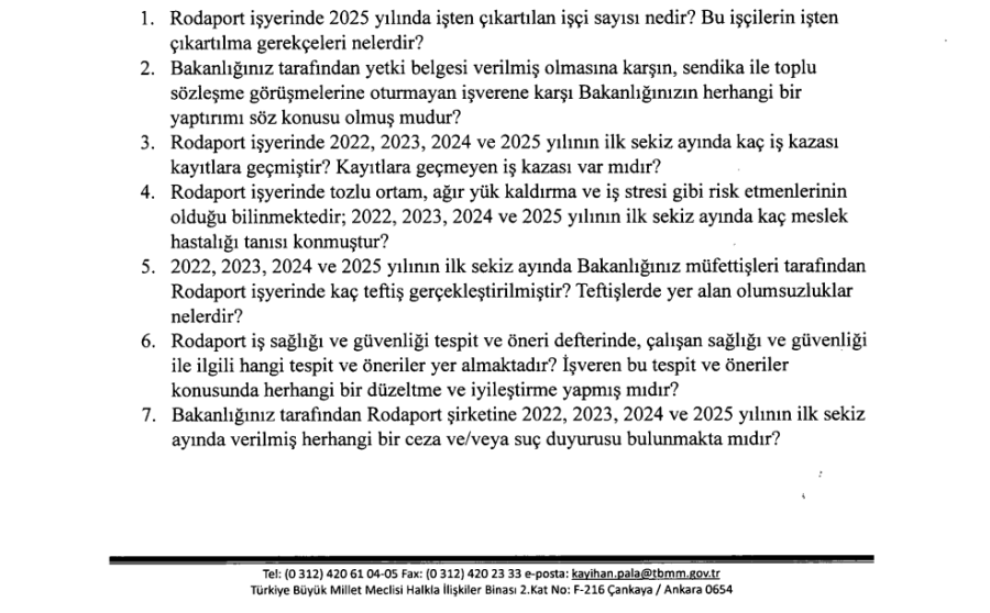Türkiye'de işçi sağlığı ve iş güvenliği hizmet sunumundaki eksikliklerin bir halk sağlığı sorunu haline geldiğini hatırlatan Pala, Rodaport'ta son dönemde meydana gelen iş kazalarının sayısı, niteliği ve kaza tarihine göre dağılımının kamuoyuna açıklanmasını da istedi. Pala ayrıca, kayıtlara geçmeyen kazalara dair iddiaların araştırılmasını talep ederek kaza kayıt sisteminin nasıl işletildiğini, işyerindeki risk değerlendirme bulgularını, İşyeri İş Sağlığı ve Güvenliği Tespit ve Öneri Defteri'nde yer alan sorunları ve eksiklik tespit edilip edilmediğini sordu.