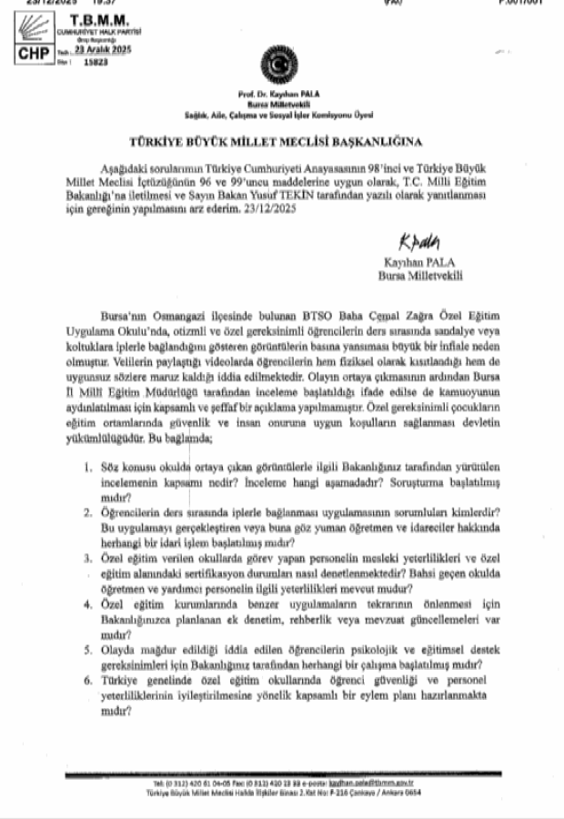 Cumhuriyet Halk Partisi Sağlık Politika Kurulu Başkanı ve Bursa Milletvekili Prof. Dr. Kayıhan Pala, Bursa'nın Osmangazi ilçesindeki BTSO Baha Cemal Zağra Özel Eğitim Uygulama Okulu'nda bazı öğrencilerin sandalyelere bağlandığını gösteren görüntülerin dehşet verici olduğunu ve kamuoyunda haklı bir infial yarattığını dile getirdi. Pala, "Velilerin paylaştığı videolarda özel gereksinimli öğrencilerin hem fiziksel hem de sözlü şiddete maruz kaldığı gözlenmektedir. Bakanlık, özel gereksinimli çocukların onurunu hiçe sayan bu uygulamaların neden önlenmediğini açıklamalıdır." sözleriyle Milli Eğitim Bakanı Yusuf Tekin'i açıklamaya davet etti.