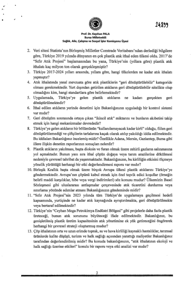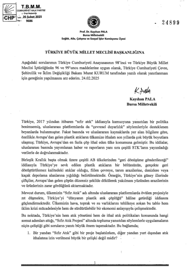 CHP Bursa Milletvekili Prof. Dr. Kayıhan Pala, Türkiye'nin hızla artan plastik atık ithalatı nedeniyle tarım arazilerinden soluduğumuz havaya kadar tüm ekosistemin risk altında olduğuna dikkati çekerek, Çevre, Şehircilik ve İklim Değişikliği Bakanı Murat Kurum'un yanıtlaması istemiyle TBMM'ye kapsamlı bir soru önergesi sundu. Önerge, "Sıfır Atık" söyleminin uluslararası arenada propaganda malzemesi yapılırken Türkiye'nin AB'nin plastik atık çöplüğüne dönüştüğüne ilişkin tartışmaları gündeme taşıdı. Şubat ayında verilen önergeye, aradan geçen sürede Bakanlık tarafından yanıt verilmedi.