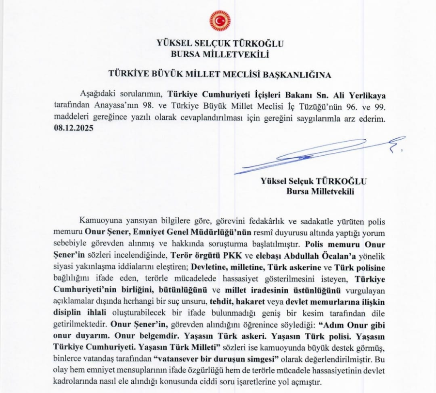 İYİ Parti Bursa Milletvekili Selçuk Türkoğlu, konuyu Meclis gündemine taşıyarak İçişleri Bakanı Ali Yerlikaya'nın yanıtlaması istemiyle 11 soruluk kapsamlı bir soru önergesi sundu.