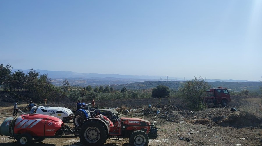 Bursa'da Mudanya Mürsel Mahallesi'nde çöplüğe dökülen atıklardan çıkan yangın, rüzgarın da etkisiyle kısa sürede çevredeki anız ve zeytinliklere sıçradı. İtfaiye ve köylülerin müdahalesiyle söndürüldü.