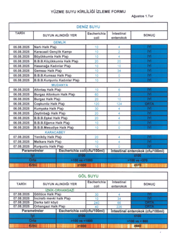 Bursa'da yapılan analizler sonucunda plajlarında Ağustos ayı 1. Tur Yüzme Suyu Kirliliği İzleme raporu yayınlandı.