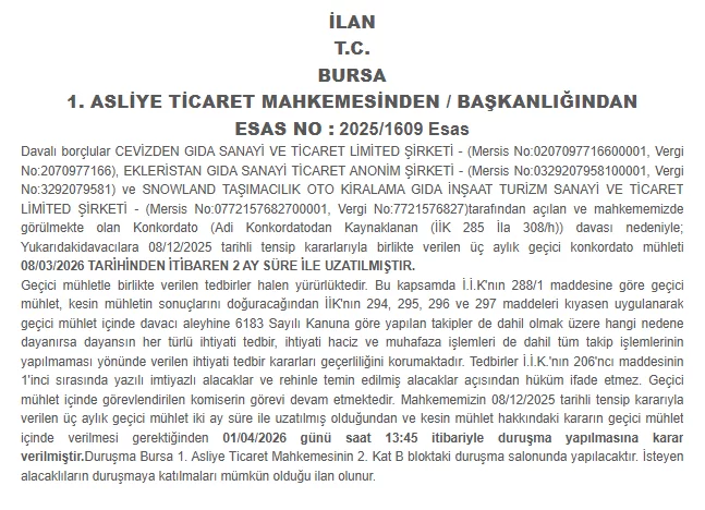 Bursa 1. Asliye Ticaret Mahkemesi, konkordato davası kapsamında Ekleristan Gıda Sanayi Ticaret A.Ş., Cevizden Gıda Sanayi ve Ticaret Ltd. Şti. ve Snowland Taşımacılık Oto Kiralama Gıda İnşaat Turizm Sanayi ve Ticaret Ltd. Şti. tarafından yapılan başvuru değerlendirildi.